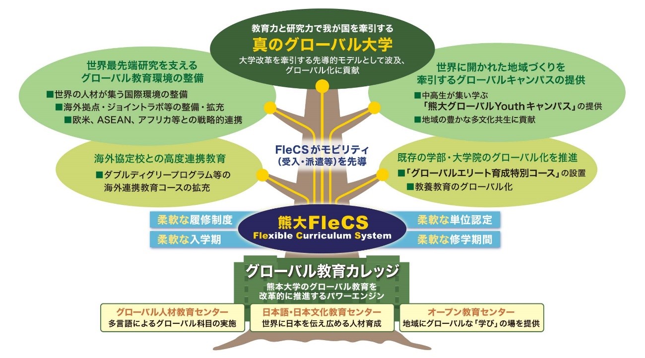 本学の構想では、多言語文化総合教育センター?を熊本大学のグローバル化を改革的に推進するパワーエンジンとして国際通用性の高い学部教育のグローバル化を図ります。