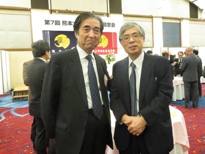 講演会終了後に開催された交流会では、まず古島幹雄熊本大学理事(副学長、昭和51年理学部卒)、峯健二関西連合同窓会会長(昭和52年工学部卒)、安田宏正九州連合同窓会会長(昭和42年法文学部卒)からの挨拶と祝辞が述べられ、江口工顧問(昭和28年工学部卒)の発声により乾杯が行われ、参加者 は賑やかに世代や学部を超えた交流を楽しみました。