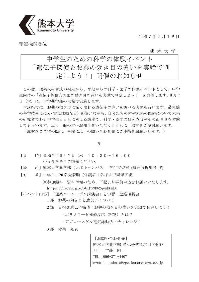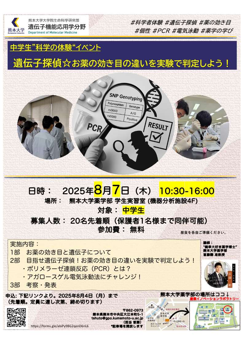 中学生 "科学の体験" イベント「遺伝子探偵☆お薬の効き目の違いを実験で判定しよう!」を実施します (令和7年8月7日(木))